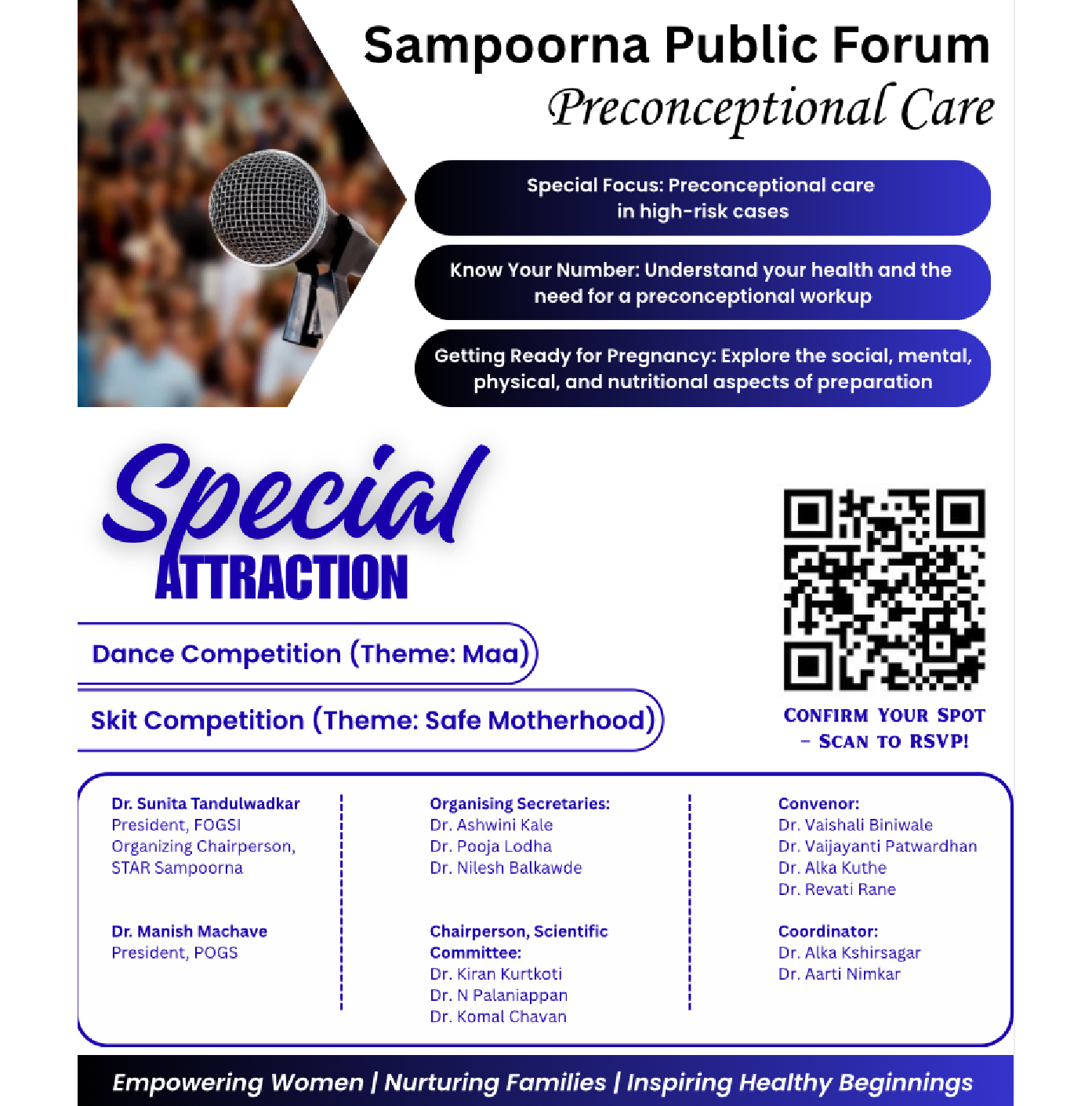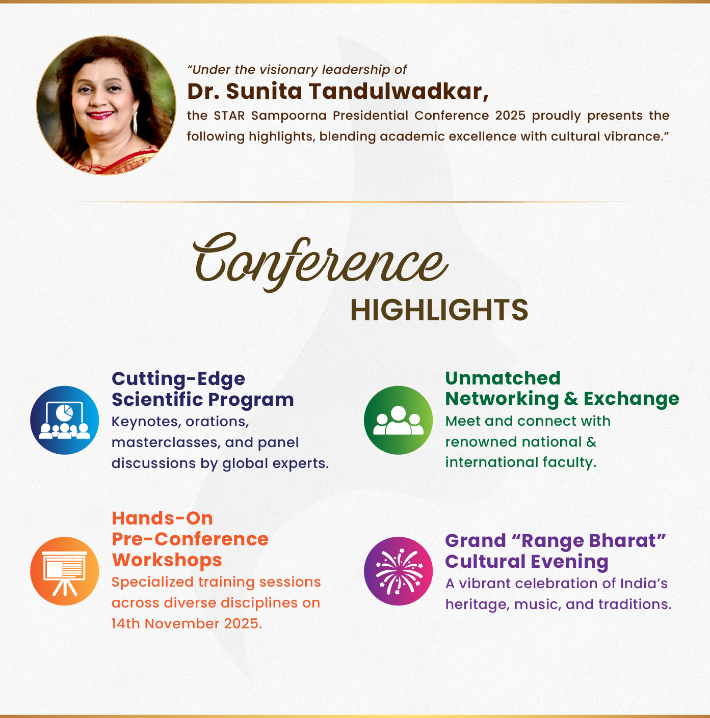 STAR Sampoorna 2025 brings together distinguished faculty, thought leaders, and delegates from across the country and beyond. The scientific program has been carefully curated to offer cutting-edge updates, multidisciplinary perspectives, and transformative ideas that will shape the future of women’s healthcare. Beyond academics, this meeting is also a celebration of connections, camaraderie, and the shared vision of creating healthier lives for women everywhere. We hope you will find this conference not just enriching, but also inspiring and memorable.